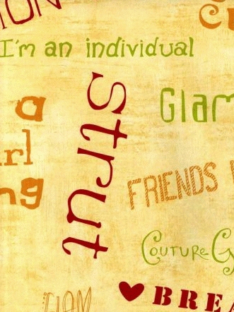 Stenska tapeta za otroške in mladinske sobe. Rumena podlaga z barvnimi napisi.