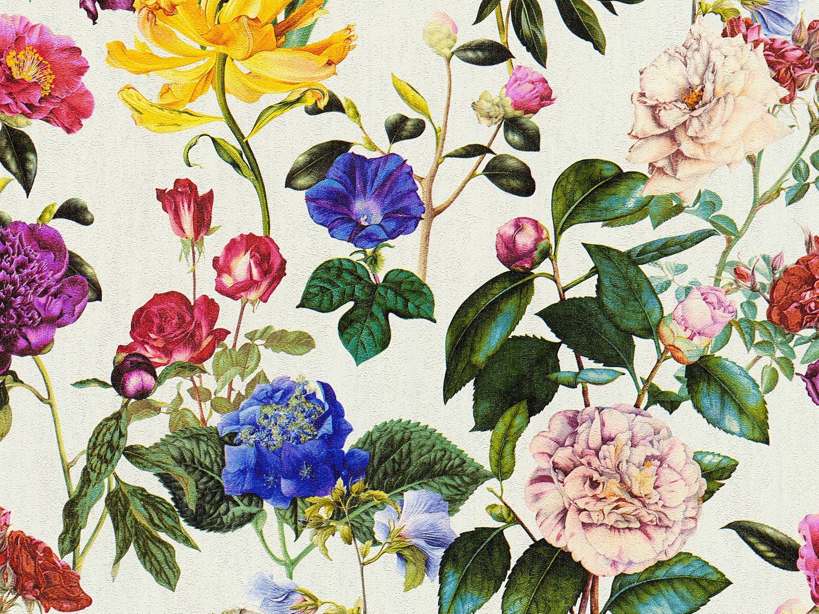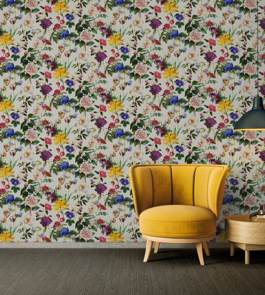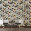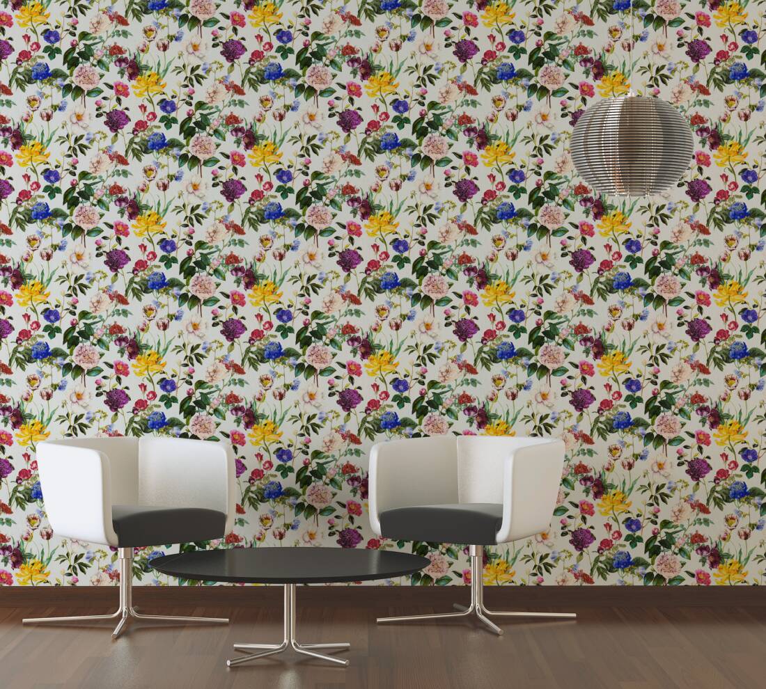 Stenska tapeta s cvetličnim vzorcem na ozadju bež barve ustvarja prijeten bivalni ambient in doda prostoru moderen videz.